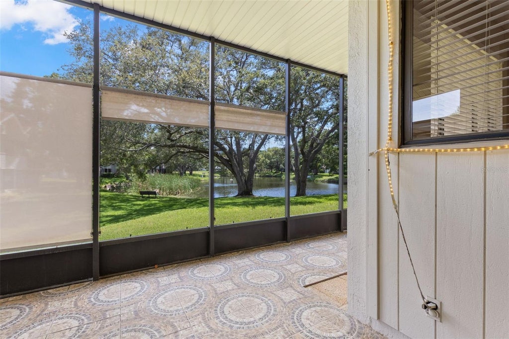 Welcome to your new home—the last unit on the right, nestled in a peaceful corner of the community with lush green space right next door for added privacy and tranquility. Your HOA fee includes roof, grounds and exterior maintenance, community pool, sewer, water and trash. This end-unit villa features 2 bedrooms, 2 bathrooms, and a 2-car garage, with charming outdoor and indoor living spaces that blend comfort and convenience. As you pull into your private driveway, you'll appreciate the ample parking for both you and your guests. A gated walkway leads you into your outdoor patio area—perfect for a morning coffee or transforming into an outdoor living or dining space. Just across the patio is access to your two-car garage, which also includes your washer and dryer, tub sink, built-in storage cabinets with plenty of space. Enter the home through the front door, and immediately to your right is a sunny kitchen featuring a breakfast nook, ample cabinetry, tile backsplash, double stainless steel sink, 5-burner flat-top stove, refrigerator and dishwasher. The kitchen flows into your spacious dining area, ideal for entertaining and seamlessly connected to the open living room. Just off the dining space is a built-in wet bar with sink, cabinets, and open shelving—great for serving guests or creating a coffee or wine station. Step down into your light-filled living room, where vaulted ceilings, extra windows, and sliding glass doors to the screened lanai bring the outdoors in. Enjoy peaceful pond views from the comfort of your sofa or while relaxing in your lanai. Through double doors off the dining room lies your private primary suite, offering a large bedroom area, oversized walk-in closet, generous linen closet with built-in shelving, en suite bath with dual sink vanity and tub/shower combination. At the front of the home, you'll find the second bedroom, also bathed in natural light with a full-sized wall closet. The second full bathroom—also with a tub/shower combo—is located just off the hall, making it perfect for guests or family members. Additional Highlights include end-unit location for extra privacy, serene pond views, screened-in lanai for year-round enjoyment, light and bright living spaces, and community clubhouse and pool. Ideally located with easy access to US Highway 19, nearby shopping, restaurants, and beaches, this townhome is situated in a highly desirable and peaceful community. It’s the perfect blend of convenience and relaxation. Don’t miss the chance to call this beautiful townhome your own. Schedule your private showing today—this gem won’t last long!
